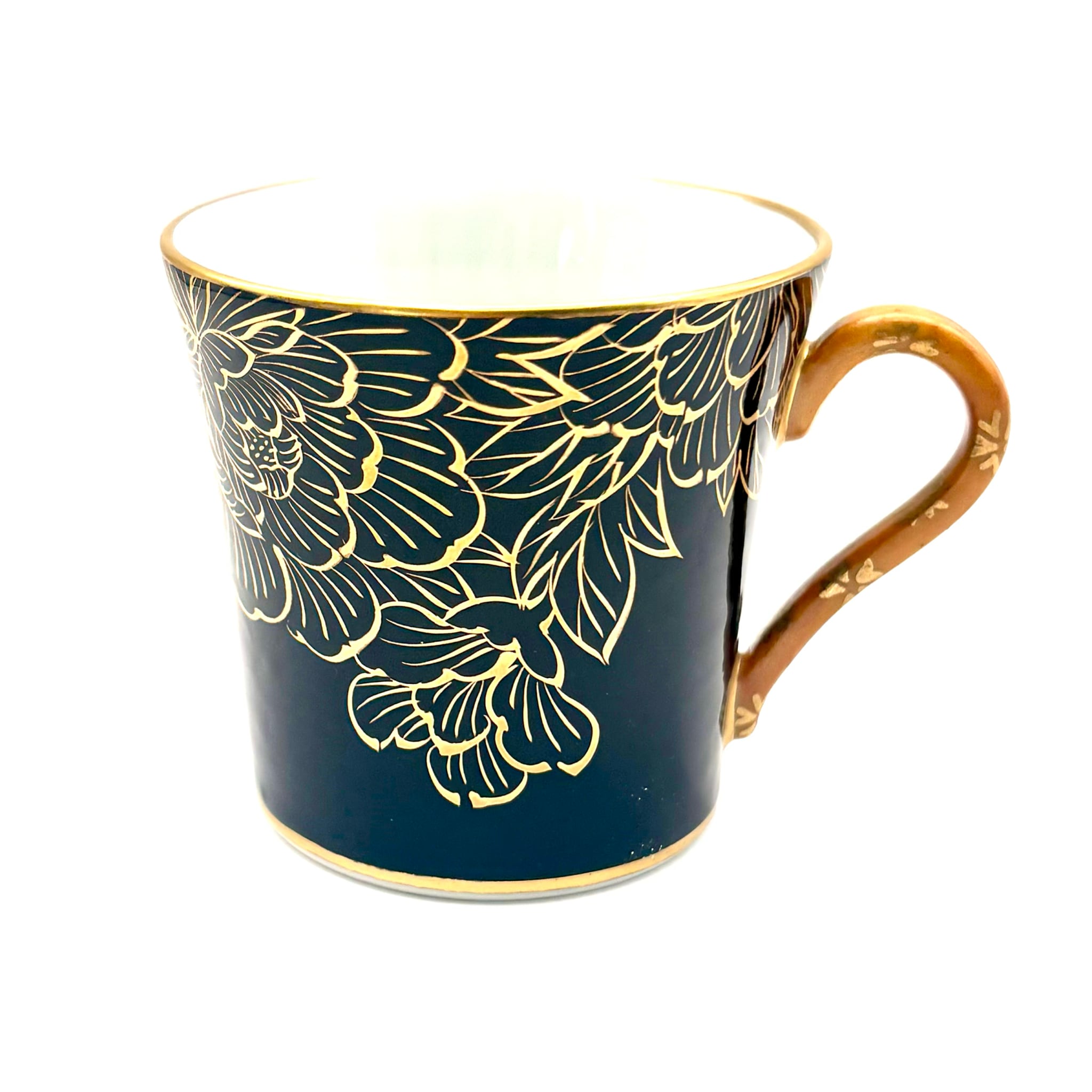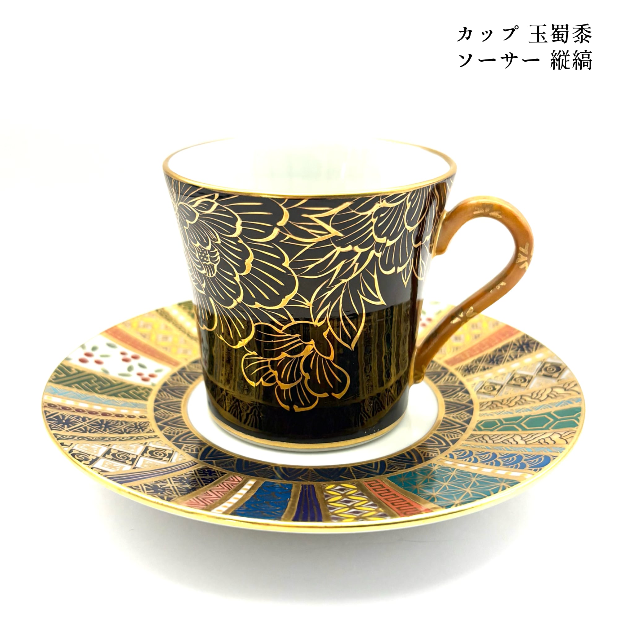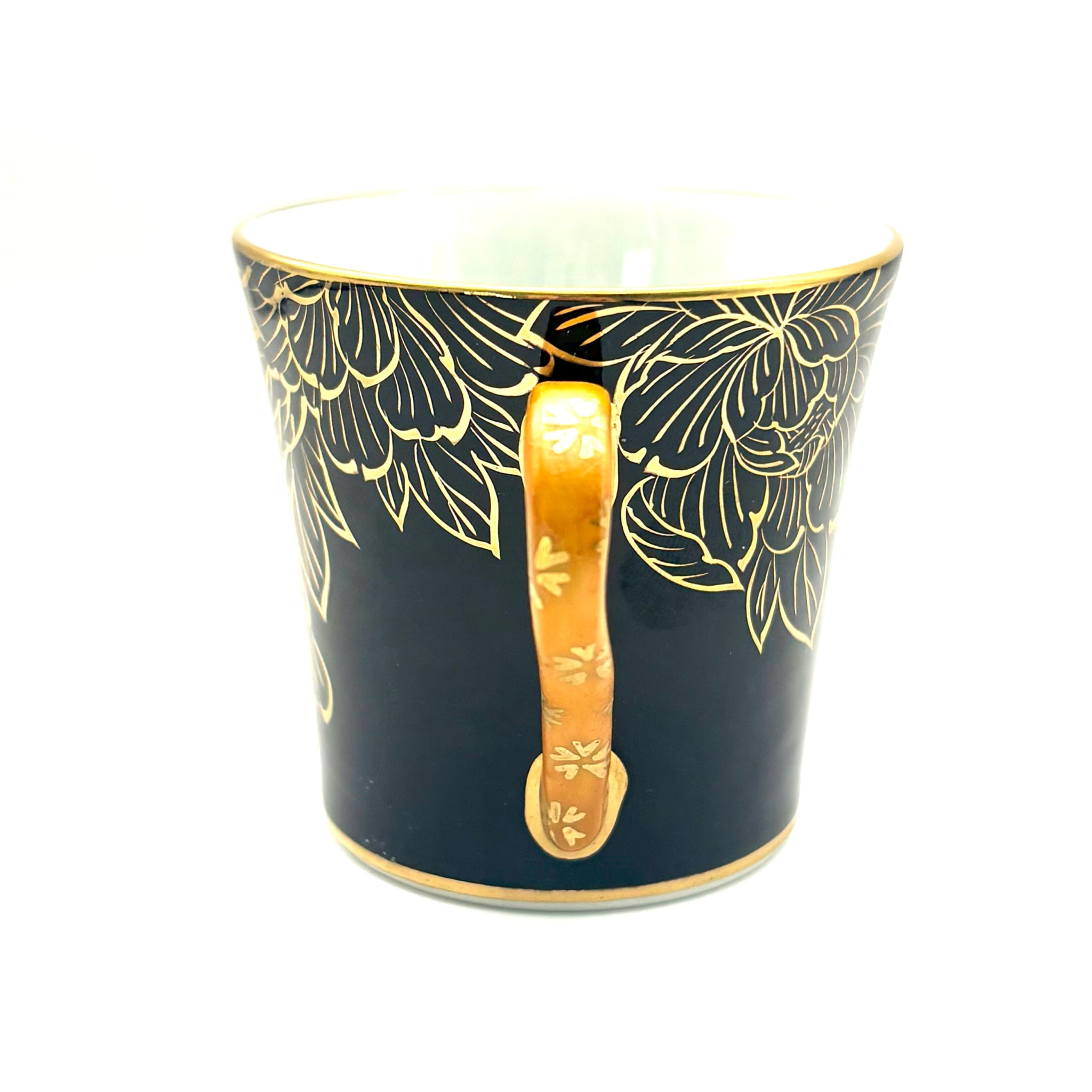 黒地のカップには全面に大胆に牡丹が描かれています。