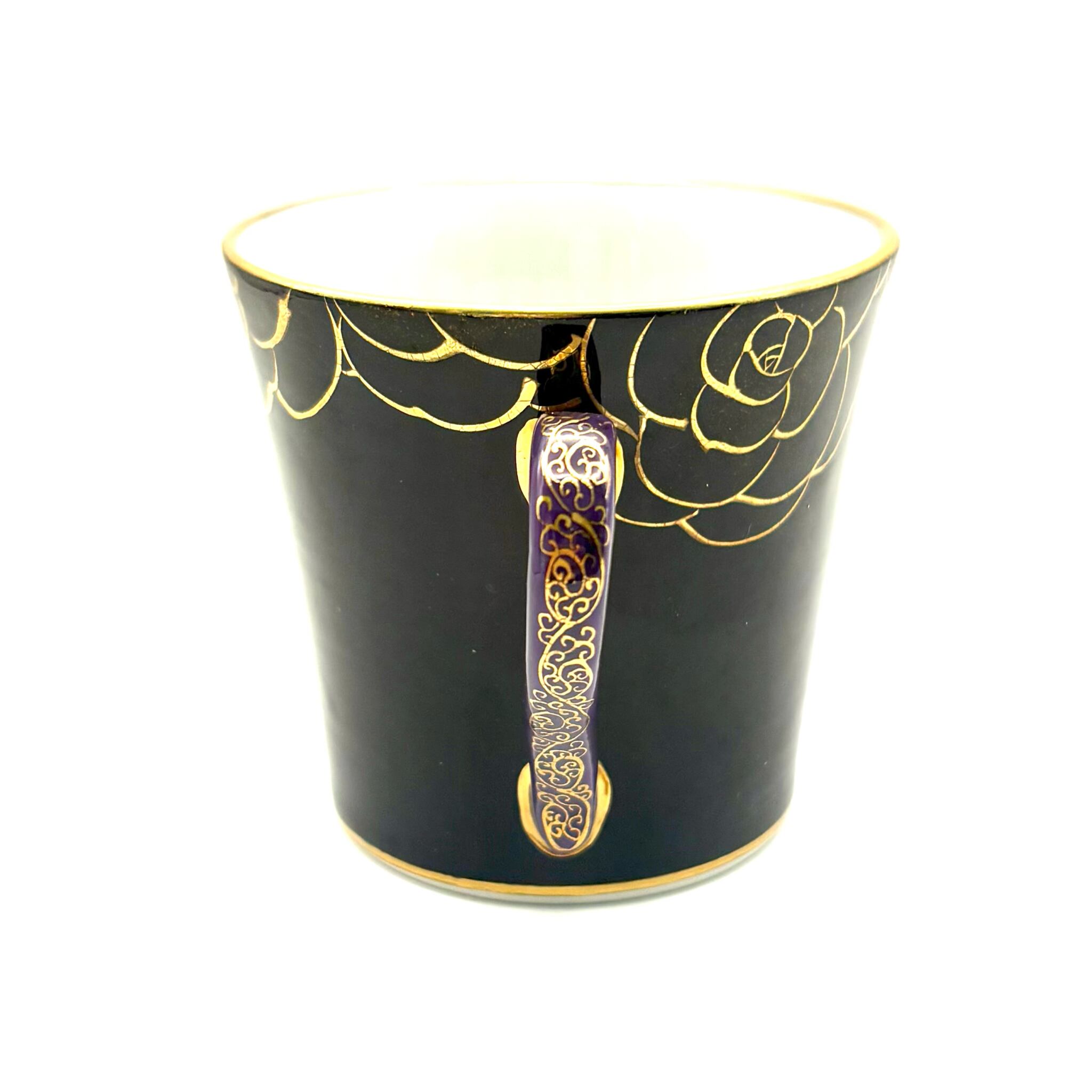黒地のカップには可愛らしい薔薇の花が描かれています。