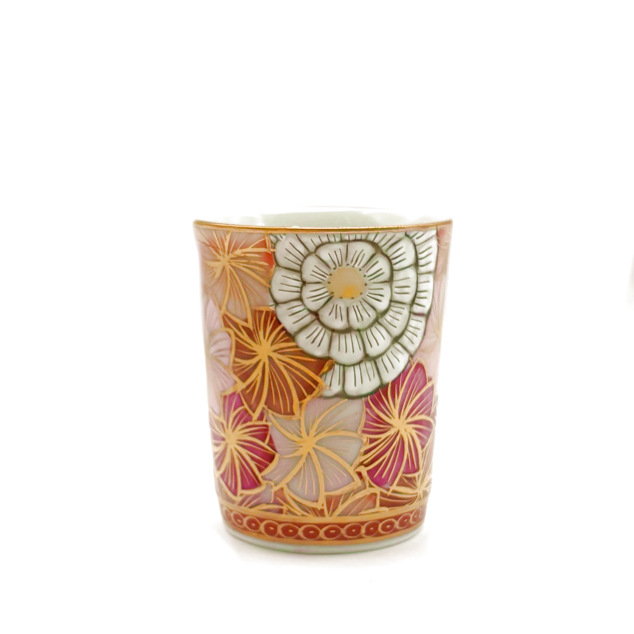 横4.3cm 縦5cm 切り立て形のおちょこです。 まるで風車のような可愛らしいお花を描き詰めています。 春らしく華やかに、赤や桃色を使用した色合いとなっております。 内部中央にもワンポイントで菊のお花をひとつだけあしらっており、使用している最中も楽しんでいただけるよう工夫しました。 お酒の他にも、中国茶器、煎茶器として楽しんで頂いております。 ※こちらの商品には箱が付きません。 ※写真と実物では色合いの印象が違う場合があります。 ※食洗機には入れないで下さい。
